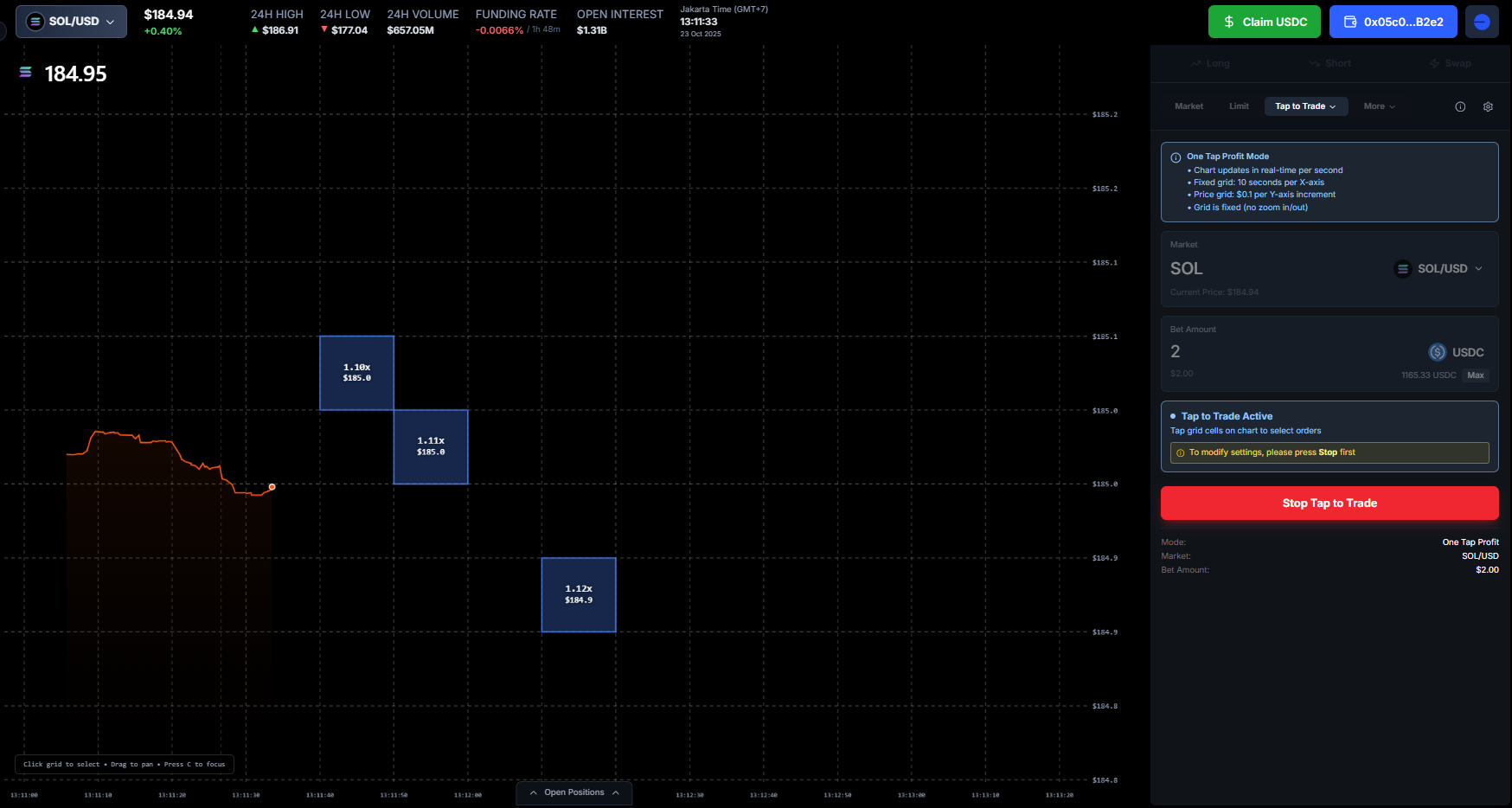 11 * @dev Users tap grid, pay USDC, win if price hits
